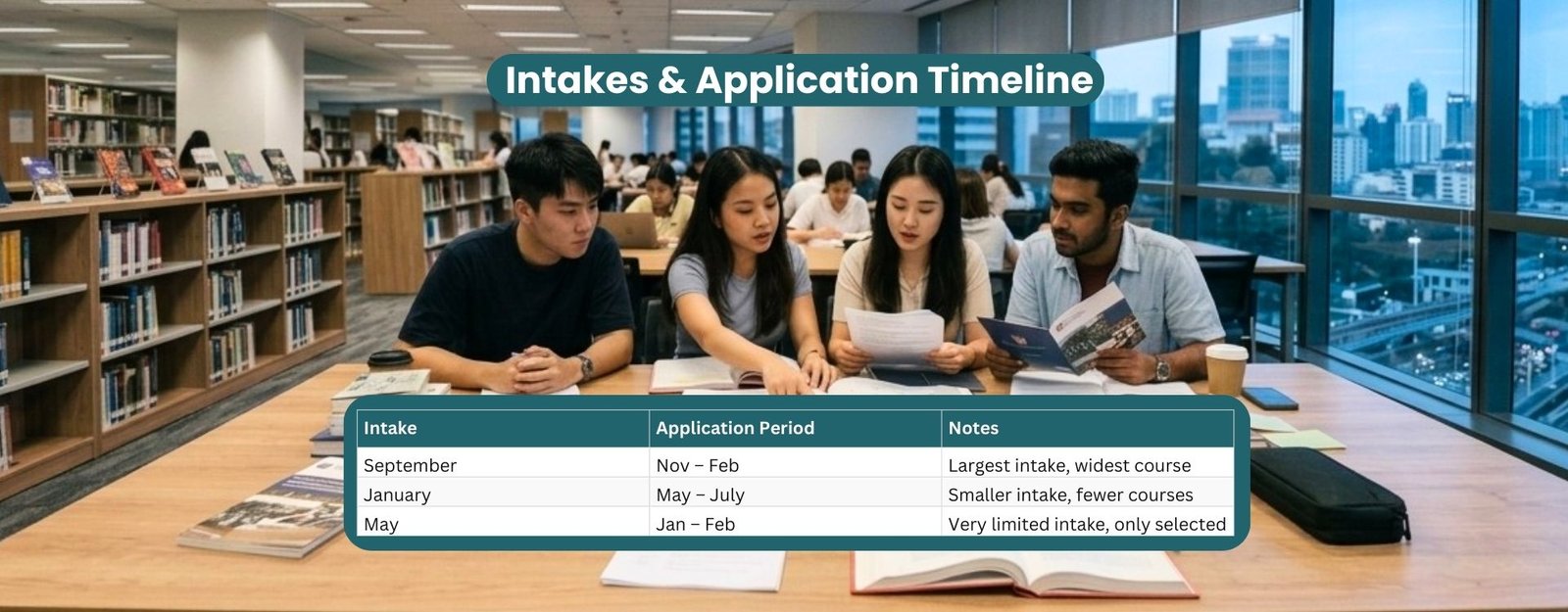 | September | Nov – Feb | Largest intake, widest course options, best chance for scholarships |